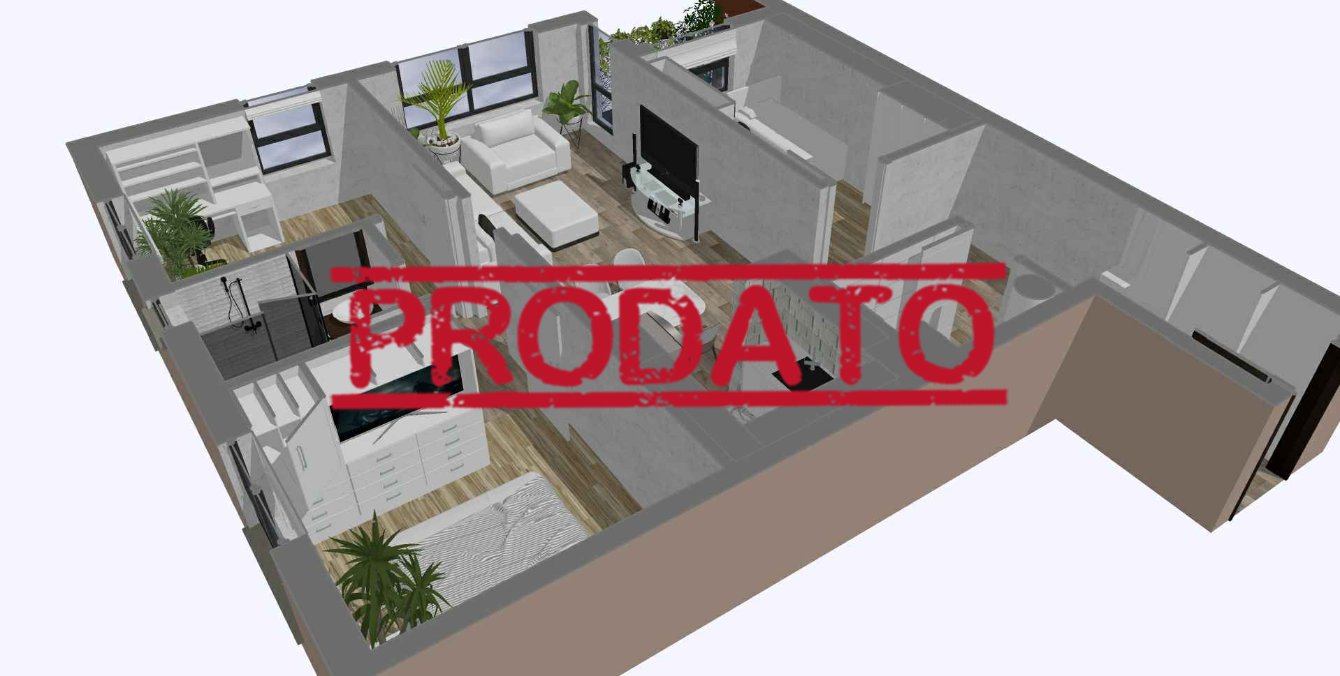 Stan je četvorosoban, površine 80,56m2. Sastoji se od ulaza 8,51m2 , dnevne sobe + kuhinje 28,54m2 , deganžmana 1,74m2 , sobe 10,74m2 , sobe 10,83m2 , sobe 10,61m2 , wc 2,81m2 , kupatila 3,37m2 i lođe 3,41m2