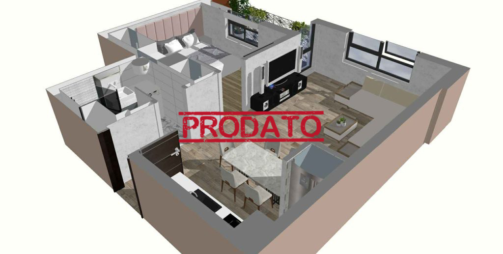 Stan je dvosoban, površine 45,86m2. Sastoji se od dnevne sobe +kuhinje 25,67m2 , sobe 12,26m2, kupatila 3,83m2 i lođe 4,10m2